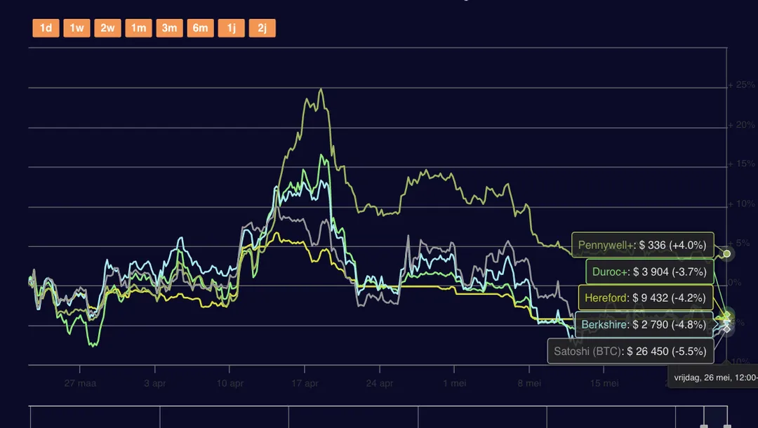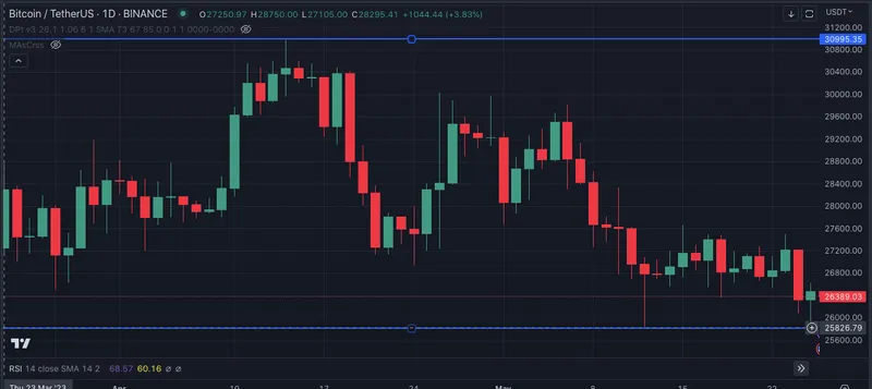 De markt is sinds half maart tussen de $26.000 en $31.000 gebleven, wat een periode is van meer dan twee maanden. Op dit moment handelt Bitcoin naar de onderkant van dat bereik voor $26.800. Dit duidt op een periode van consolidatie en een gebrek aan significante opwaartse of neerwaartse bewegingen in de Bitcoin-markt.